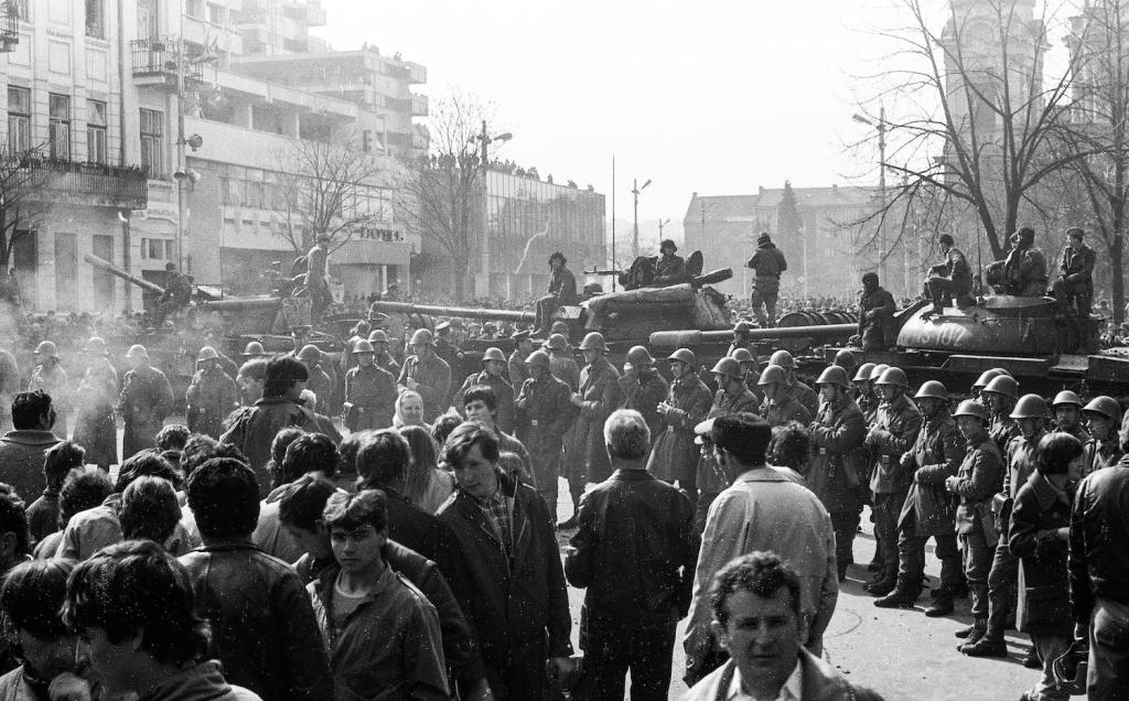 Fotó: A román hadsereg harckocsijai Marosvásárhelyen 1990 márciusában, egy évvel a romániai “rendszerváltozás” után.