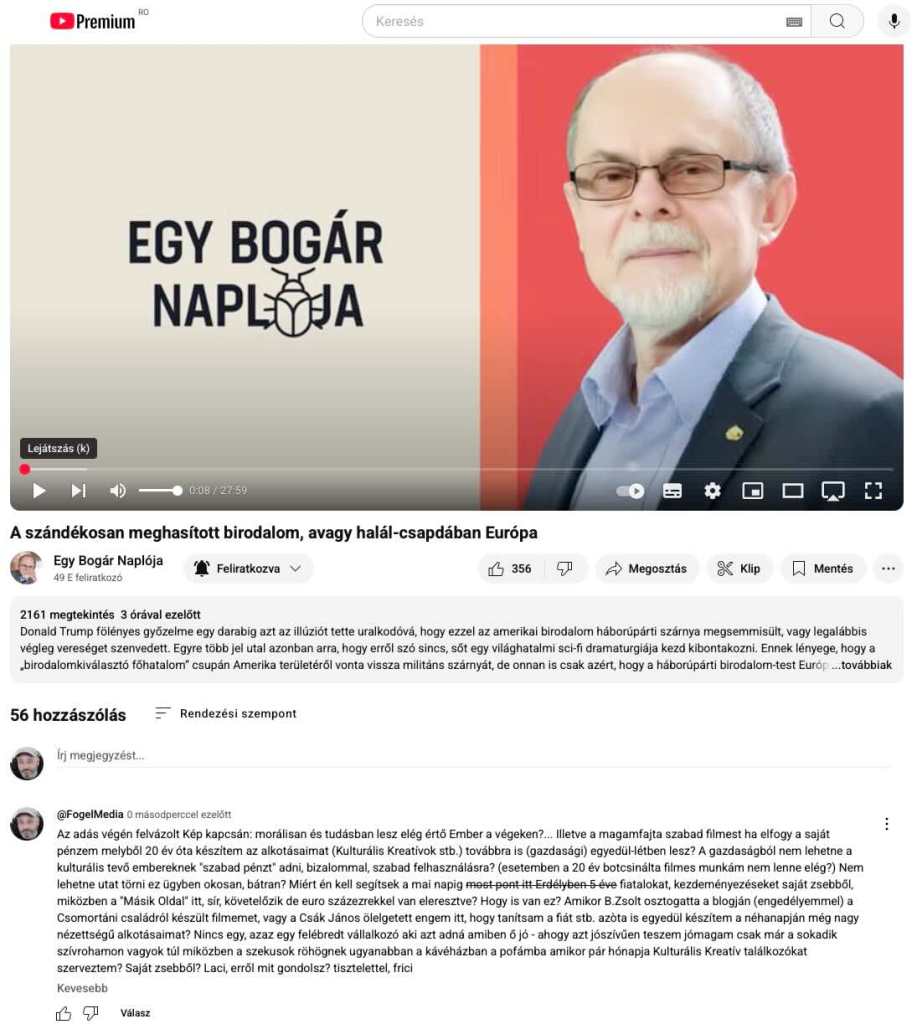 “Az adás végén felvázolt Kép kapcsán: morálisan és tudásban lesz elég értő Ember a végeken?… Illetve a magamfajta szabad filmest ha elfogy a saját pénzem melyből 20 év óta készítem az alkotásaimat (Kulturális Kreatívok stb.) továbbra is (gazdasági) egyedül-létben lesz? A gazdaságból nem lehetne a kulturális tevő embereknek “szabad pénzt” adni, bizalommal, szabad felhasználásra? (esetemben a 20 év botcsinálta filmes munkám nem lenne elég?) Nem lehetne utat törni ez ügyben okosan, bátran? Miért én kell segítsek a mai napig -most pont itt Erdélyben 5 éve- fiatalokat, kezdeményezéseket saját zsebből, miközben a “Másik Oldal” itt, sír, követelőzik de euro százezrekkel van eleresztve? Hogy is van ez? Amikor B.Zsolt osztogatta a blogján (engedélyemmel) a Csomortáni családról készült filmemet, vagy a Csák János ölelgetett engem itt, hogy tanítsam a fiát stb. azòta is egyedül készítem a néhanapján még nagy nézettségű alkotásaimat? Nincs egy, azaz egy felébredt vállalkozó aki azt adná amiben ő jó – ahogy azt jószívűen teszem jómagam csak már a sokadik szívrohamon vagyok túl miközben a szekusok röhögnek ugyanabban a kávéházban a pofámba amikor pár hónapja Kulturális Kreatív találkozókat szerveztem? Saját zsebből? Laci, erről mit gondolsz? tisztelettel, frici”
