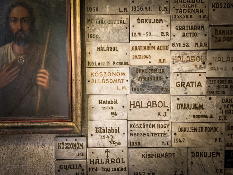 Aztán lassan eltávolodtam tőlük és eközben a periférikus látásommal konstatálhattam, hogy a sok szlovák nyelvű divatos “vidd es hozz egy könyvet” kávéházi könyvespolcok mellet egy giccses, kifejezetten izlésficamú falfestés mered rám, a jól ismert mélabús szemekkel és kifejező ajkakkal…